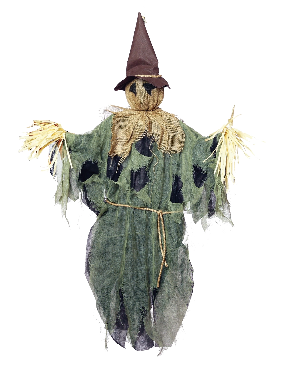 Die hängende Vogelscheuche Grün weist eine Größe von ca. 90 cm auf. In Form und Proportionen entspricht die Halloween-Hängedeko in etwa klassischen Strohmännern. Ein grünes, mit Flicken übersätes Gewand wird von einem einfachen Strick um die „Hüften“ zusammengehalten und unterstreicht in Verbindung mit stilisiertem Stroh anstelle der Hände die realistische Optik der Halloween-Deko. Mittels Schnüren und Bändern lässt sich die Strohpuppen-Deko unkompliziert an Nägeln, Schrauben o.ä. aufhängen und befestigen. Dazu passen ein Schwarze Krähe Deluxe 43 cm und ein Spinnennetz schwarz 100cm.