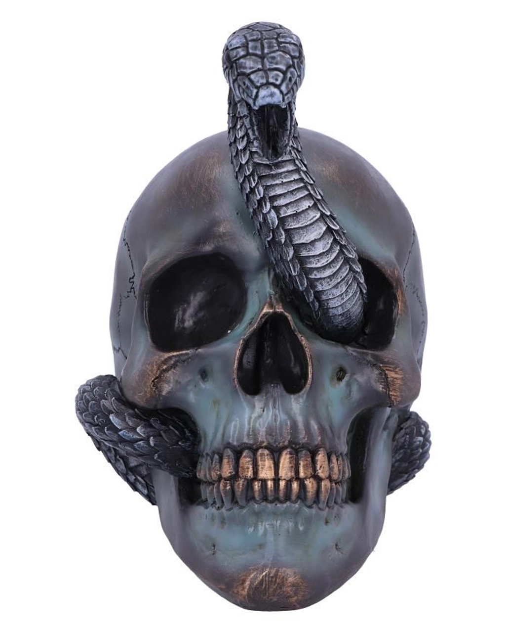 Die schuppige Schlange in Totenkopf besteht aus Kunststein und ist liebevoll von Hand bemalt. Die präzise Ausarbeitung lässt die Liebe zum Detail erkennen und wirkt super dekorativ. Sichere dir auch den Fantasy Totenschädel mit Mystic Muster