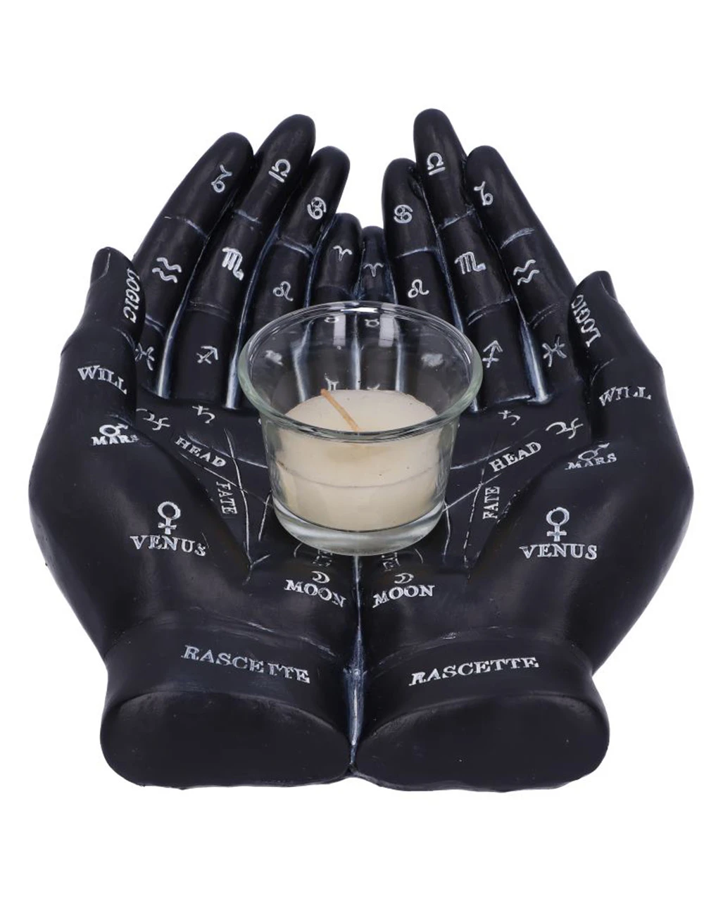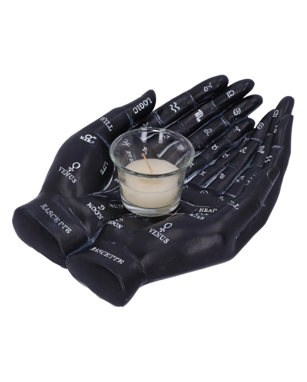 Die Handlesekunst wird auch als Chiromantie bezeichnet und geht davon aus, dass sich die Zukunft eines Menschen in seinen Hände ablesen lässt. Mit diesem Schwarze Chiromantie-Hände Teelichthalter bringst du mystisches Flair in deine vier Wände. Auch als Geschenkidee macht sich der Pagan Teelichthalter ganz hervorragend.