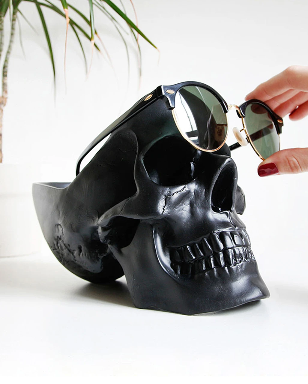 Unsere schwarze Totenschädel Schale finden allerhand Utensilien ein sicheres Plätzchen. Nutze die Totenkopf Schale als dekoratives Gothic Wohnaccessoire und befülle sie mit Süßigkeiten und Knabbereien. Auch für Halloween lassen sich hierin Süßigkeiten für den Trick or Treat anbieten. Die schwarze Skull Schale kann aber auch anderweitig genutzt werden: Bewahre beispielsweise deine Schminkpinsel oder Obst in der Schüssel auf. Ein Hingucker ist der Deko Totenkopf allemal.
