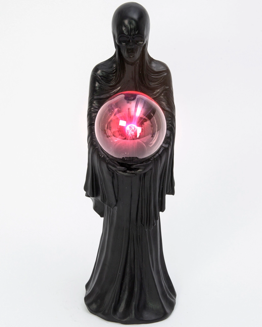 - Schwarzer Sensenmann mit beleuchteter Glaskugel