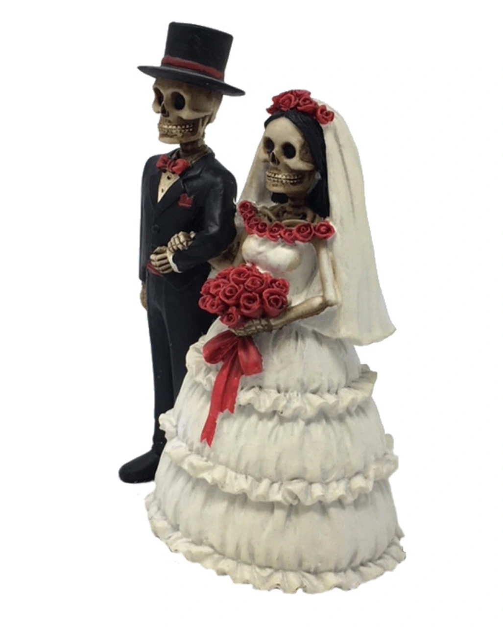 Der aus Polyresin hergestellte Deko-Knaller für Gothic & Day of the Dead-Fans wurde mit vielen liebevollen Details gestaltet. So kann man am Brautkleid die einzelnen Rüschen gut erkennen. Diese Detailfreude ist natürlich nur wegen der hochwertigen Verarbeitung möglich. Das Skelett Hochzeitspaar 14 cm wurde schließlich von Hand gegossen und dann bemalt. So sieht die entzückende tote Braut mit ihrem Brautstrauß aus roten Rosen und den für den Dia de los muertos typischen Haarreif aus roten Rosen aus, als würde sie gerade „Ja, ich will“ sagen. Den Bräutigam in seinem schicken schwarzen Anzug scheint das sehr glücklich zu machen. Er grinst mit seinem Skelett-Gesicht und strahlt über die knochigen Wangen. Passend zu seiner Braut trägt er eine rote Fliege, ein rotes Einstecktuch und ein rotes Band um den Zylinder. Dem Gothic Hochzeitspaar fehlen nur ein paar von den Künstliche Rose schwarz-weiß zur Zier für ein gelungenes Ambiente.
