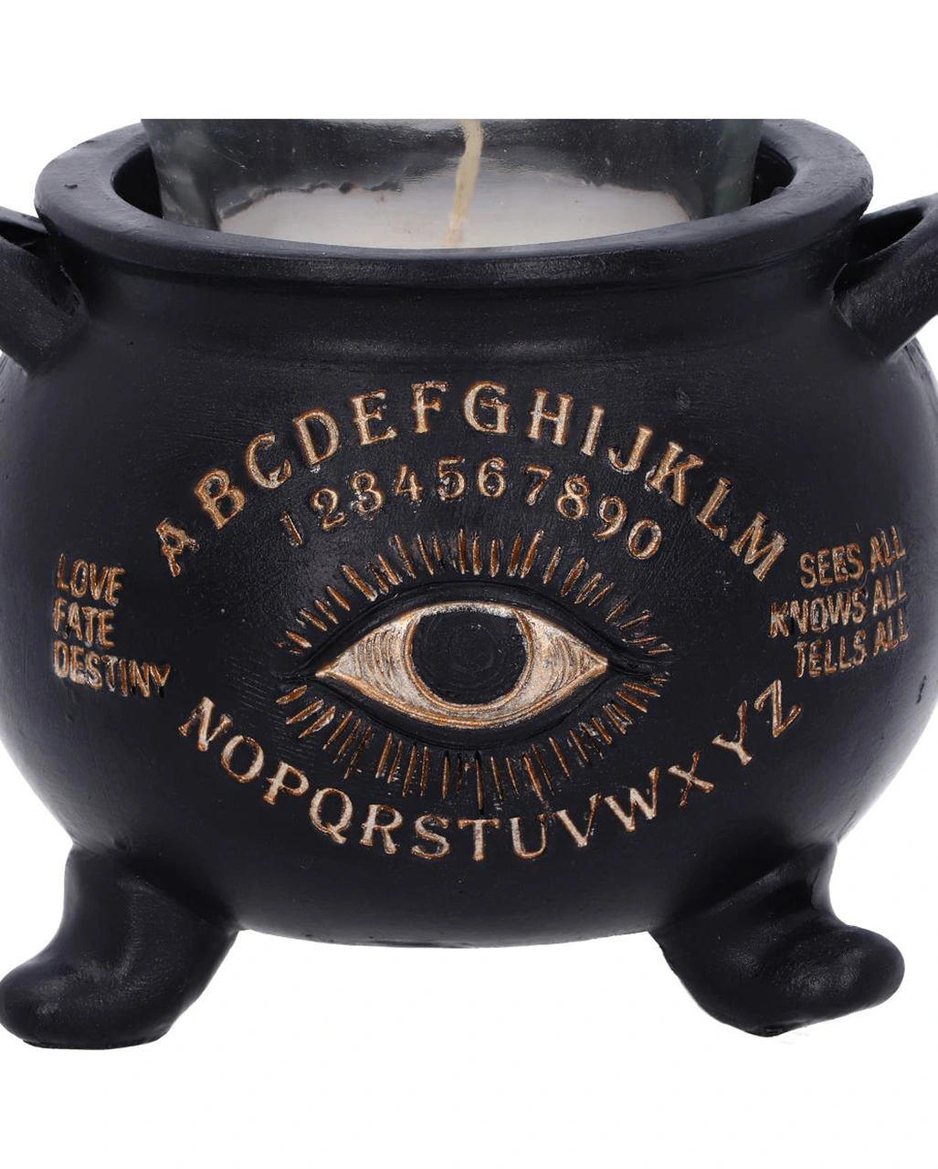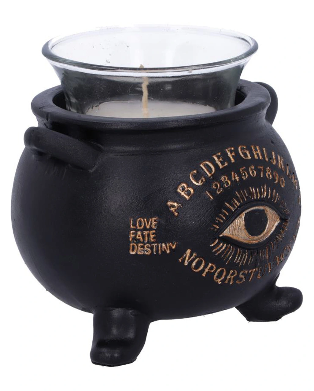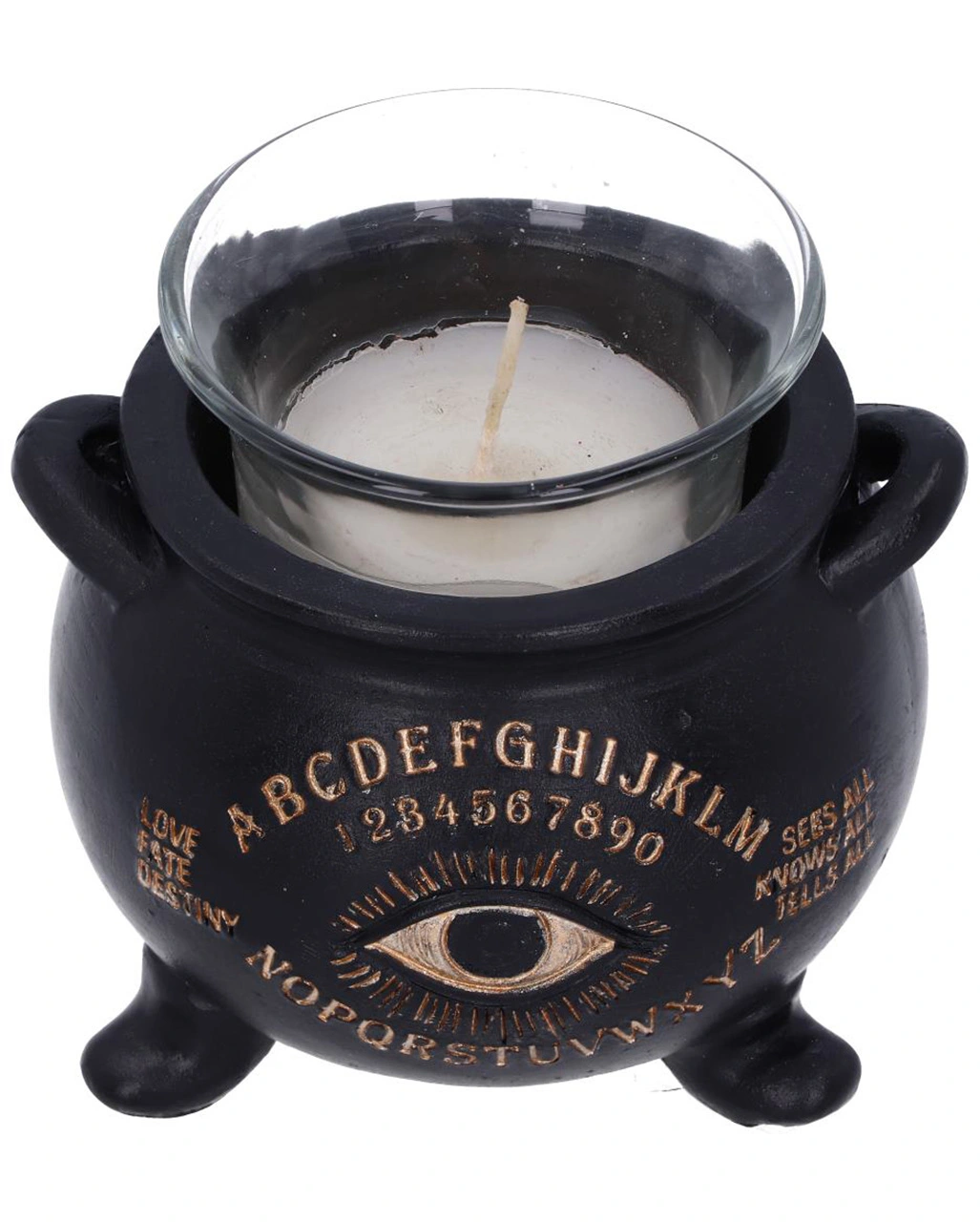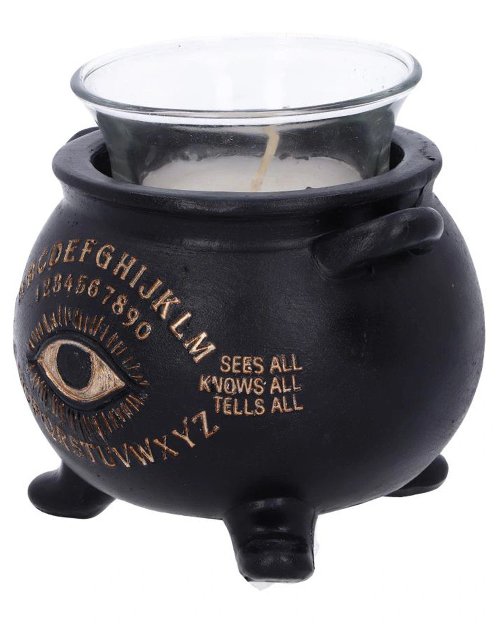 Der Spirit Hexenkessel als Teelichthalter kommt mit mystischer Symbolik. Ein allsehendes Auge ist in Gold auf dem mattschwarzen Teelichthalter abgebildet. Der Spirit Hexenkessel als Teelichthalter ist mit Ouija-Schriftzügen und -Zahlen verziert. Zudem finden sich auf ihm die Worte „Love, Fate, Destiny“ und „Sees all, Knows all, Tells all“, die das Auge flankieren.