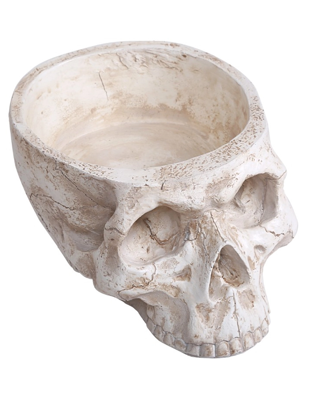 Auch als Halloween Tisch Deko ist die Totenschädel Schale 28cm bestens geeignet. Die Totenkopf Pflanzenschale hat die Farbe und die Form eines echten menschlichen Totenschädels. Man erkennt die Augenhöhlen, die Nasenlöcher, den Oberkiefer und alles, was unseren humanoiden Schädel ausmacht. Natürlich ist sie aber nicht aus Knochen, sondern wurde aus hochwertigem Polyresin gegossen. Weitere Deko für Totenkopf Fans findet ihr hier Shop!