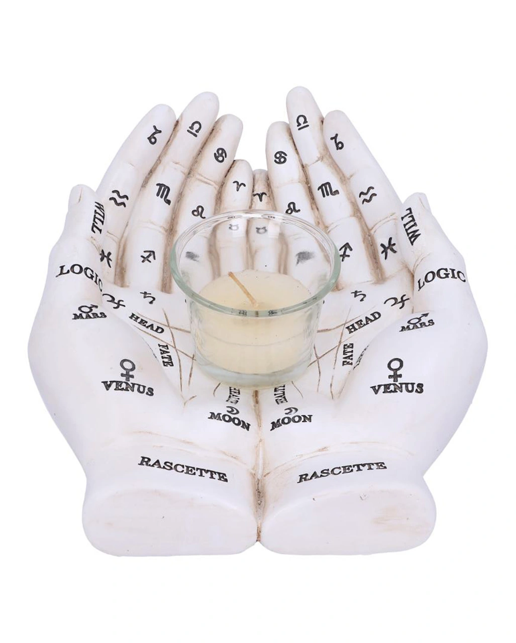 Die Chiromantie bezeichnet die alte Handlesekunst. Laut dieser kann man die Zukunft eines Menschen in seiner Handfläche ablesen. Unser Weiße Chiromantie-Hände Teelichthalter ist eine wunderschöne Esoterik Deko, die zwei geöffnete Hände aus Polyresin zeigt. In diesen befinden sich kleine schwarze Symbole und ein gläserner Teelichthalter.